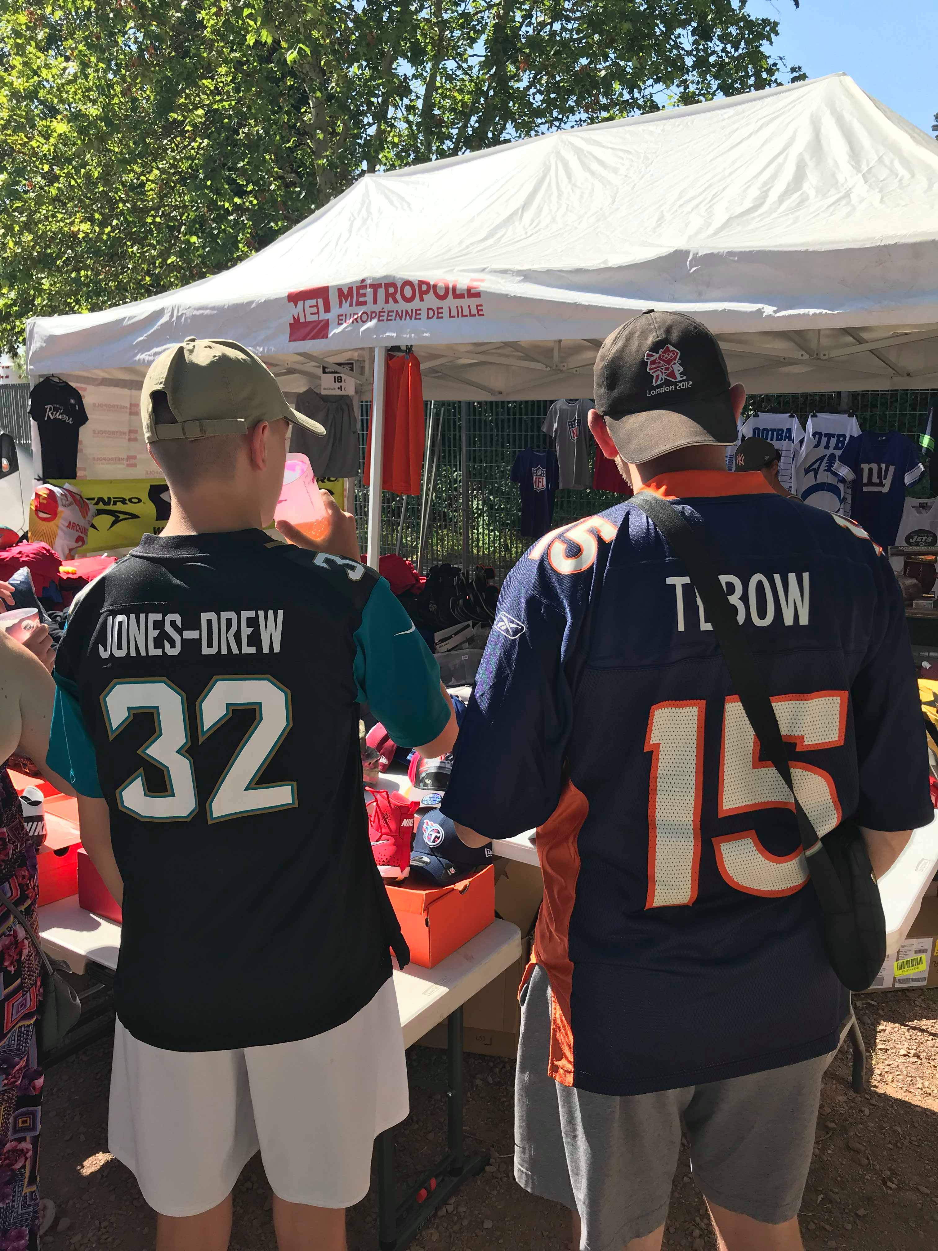 Nous avons pu observer également de nombreux points de ventes où les fans pouvaient acheter des produits dérivés des équipes de NFL, le championnat américain (casquettes, goodies, maillots…).