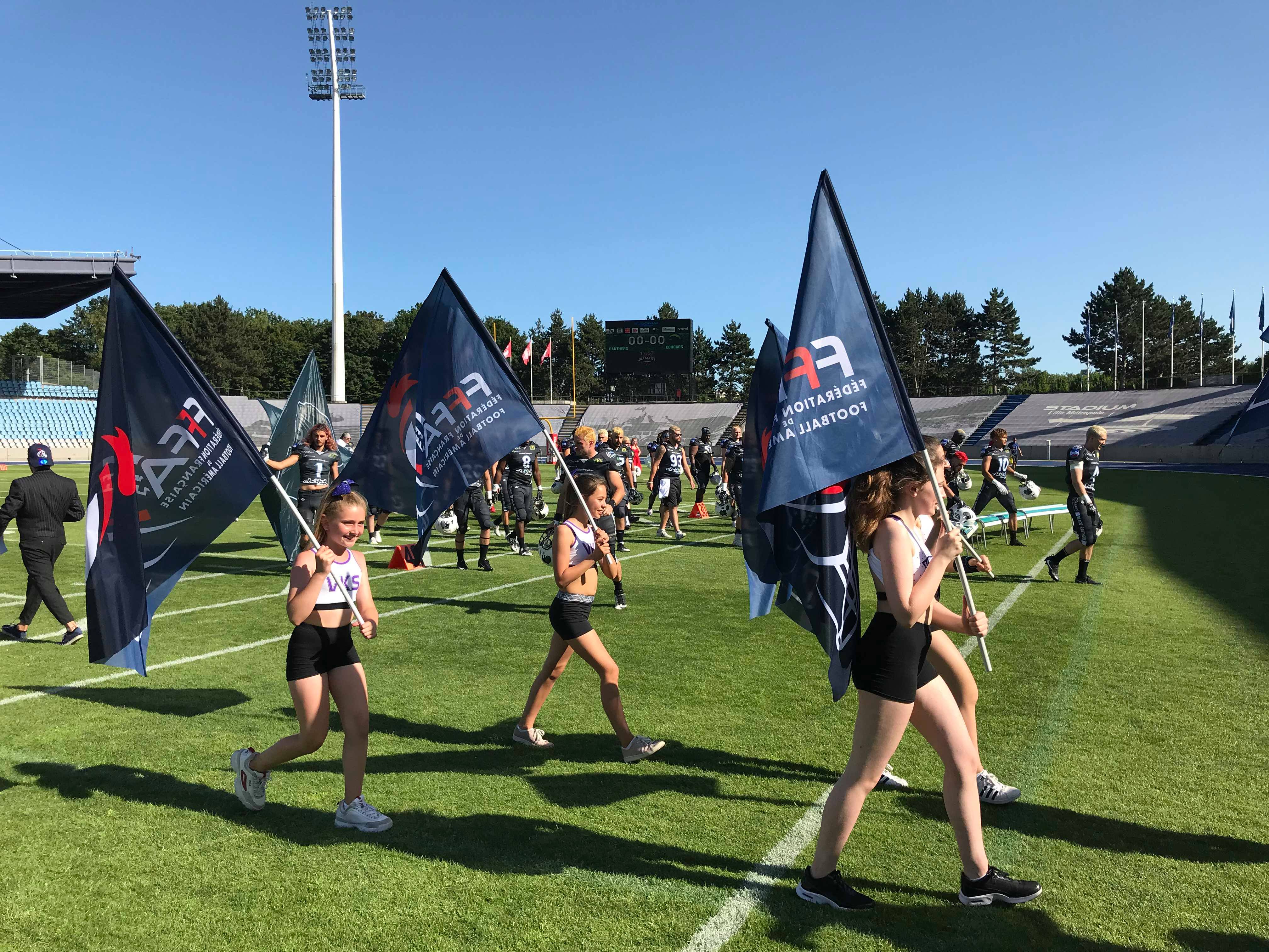 Quinze minutes avant le début des festivités, les spectateurs installés en tribunes ont pu apprécier la fanfare d’un orchestre, ainsi que le spectacle proposé par les Cheerleaders. Un esprit et des animations que l’on retrouve quotidiennement dans les stades aux États-Unis.